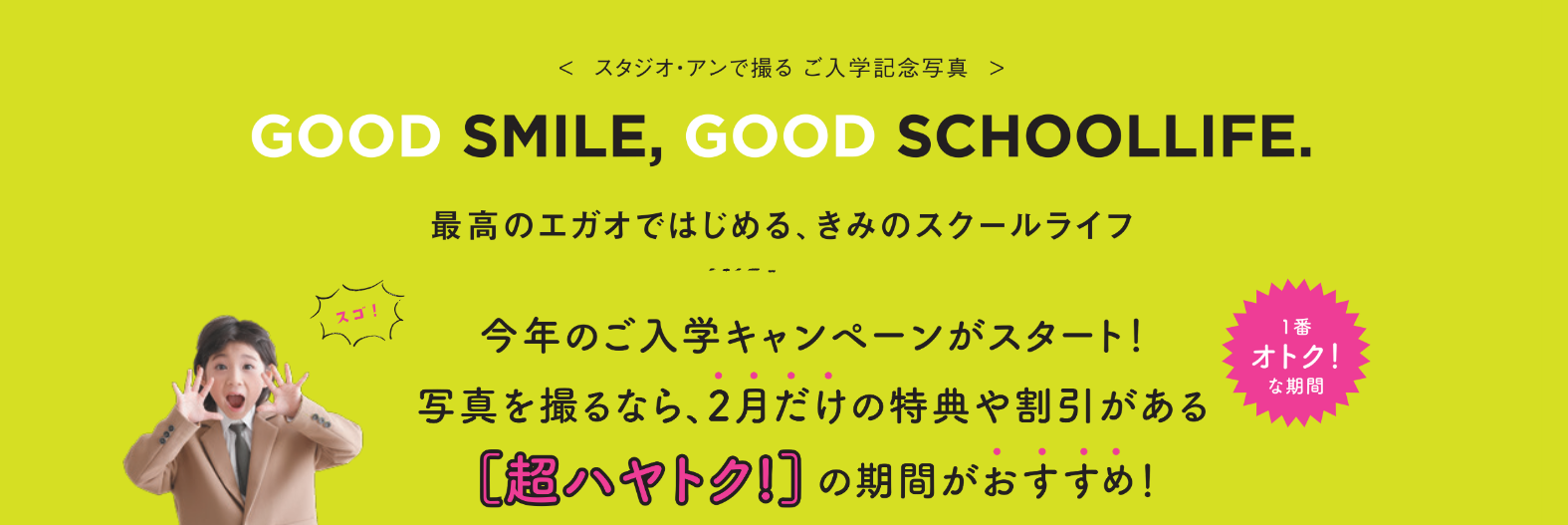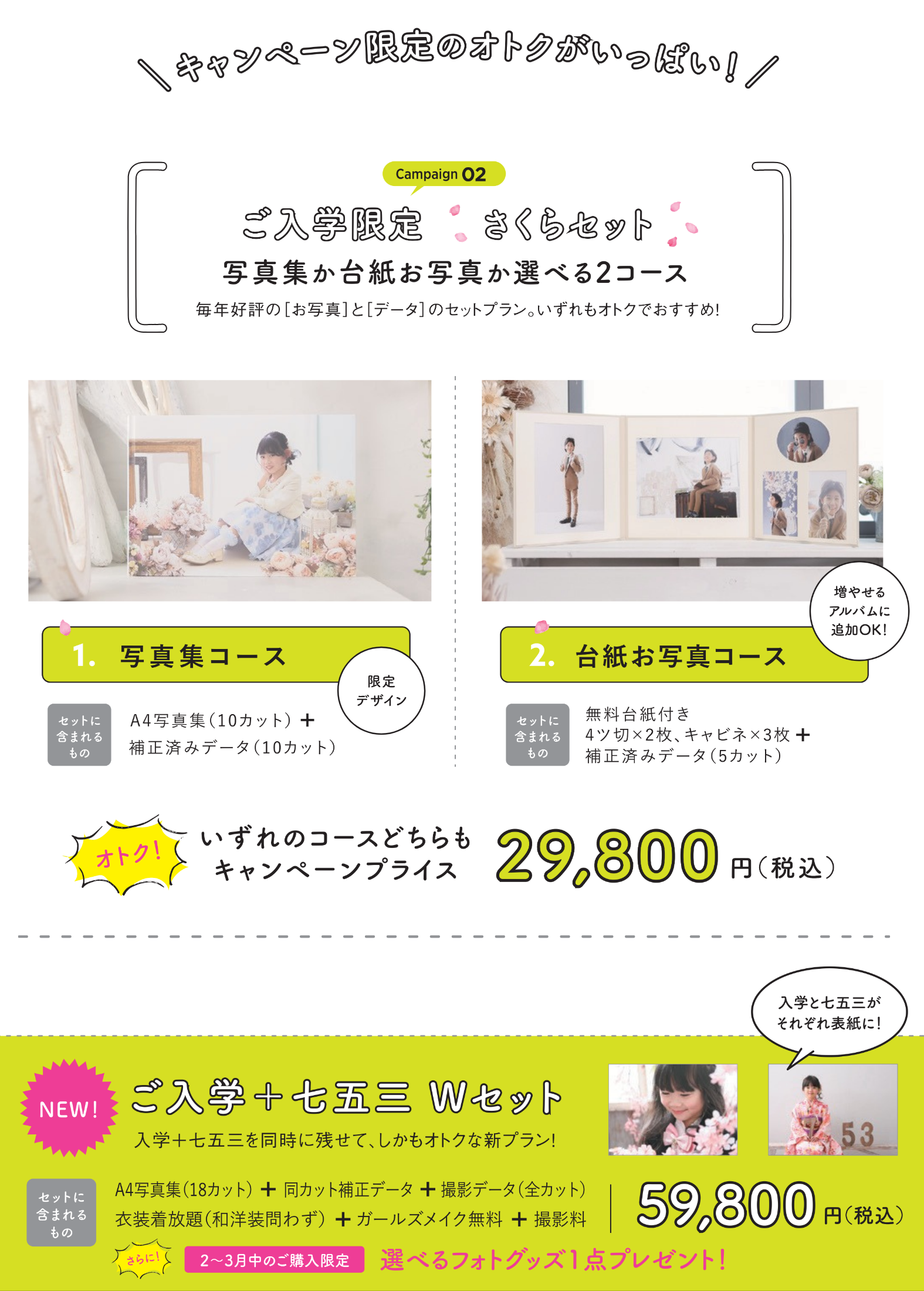 小学校ご入学キャンペーン2026につきましては、撮影料・商品プラン代は曜日による変動はございません。
