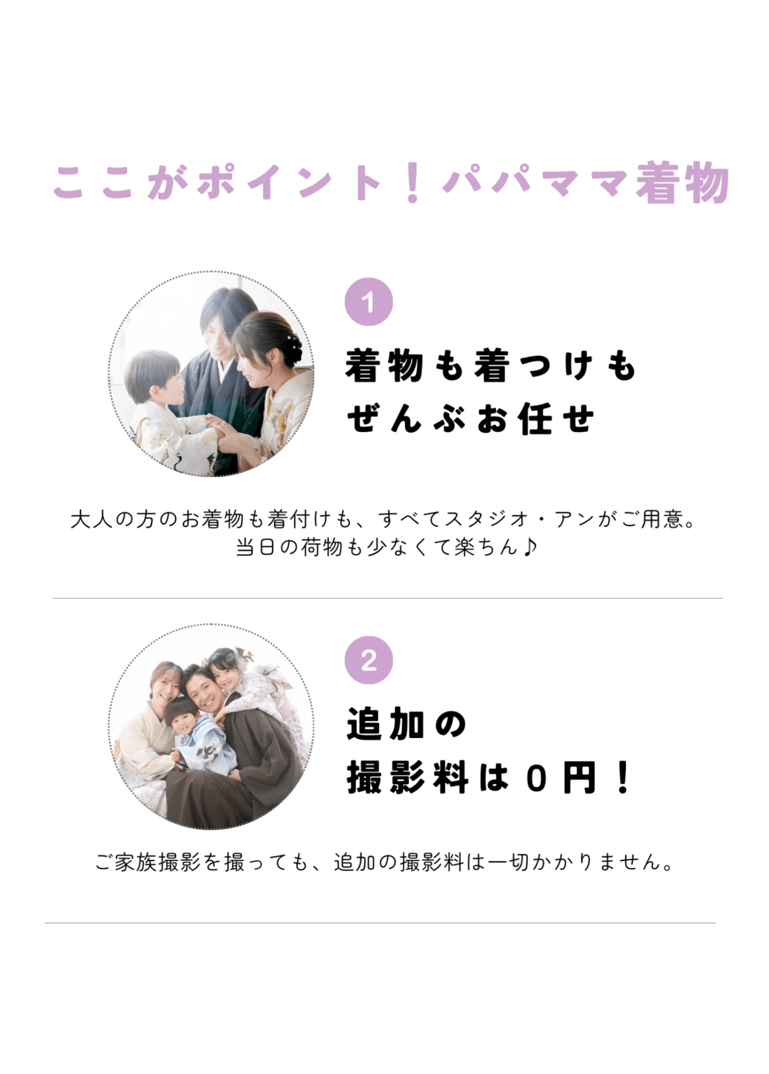 家族そろっての着物を着る機会は中々ないもの。せっかくのご入学記念、みんなで和装に着替えてご撮影を楽しみませんか?