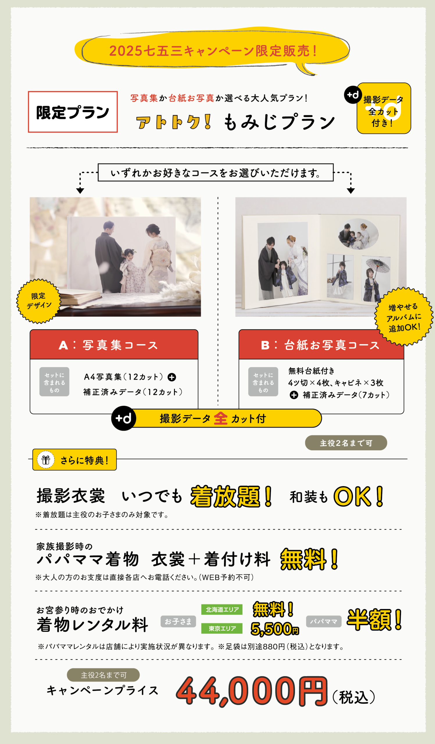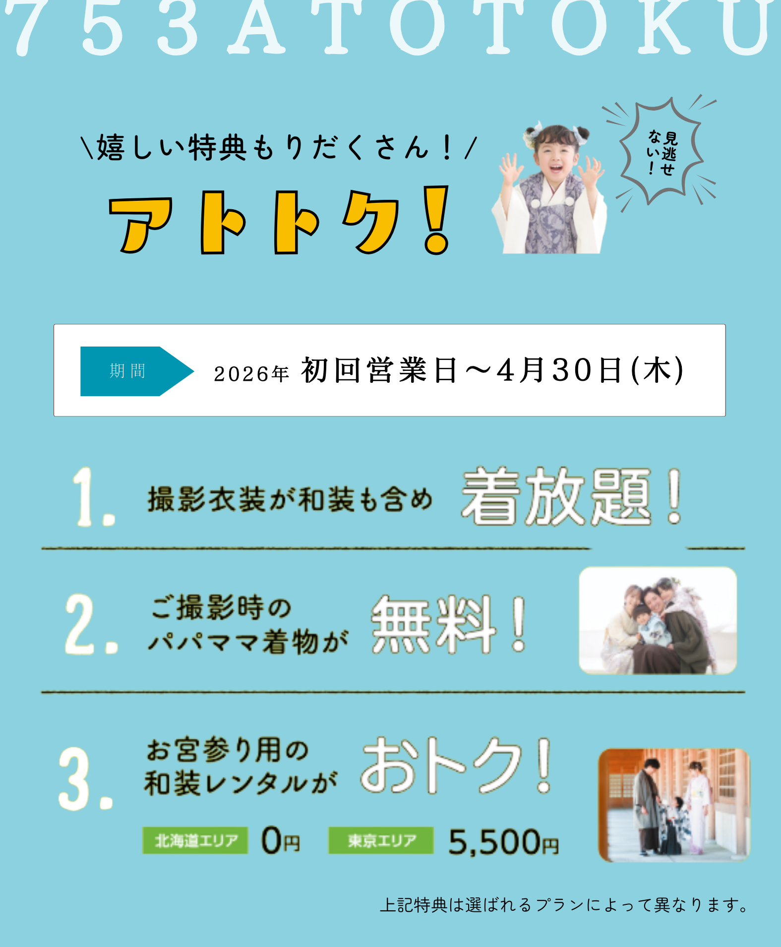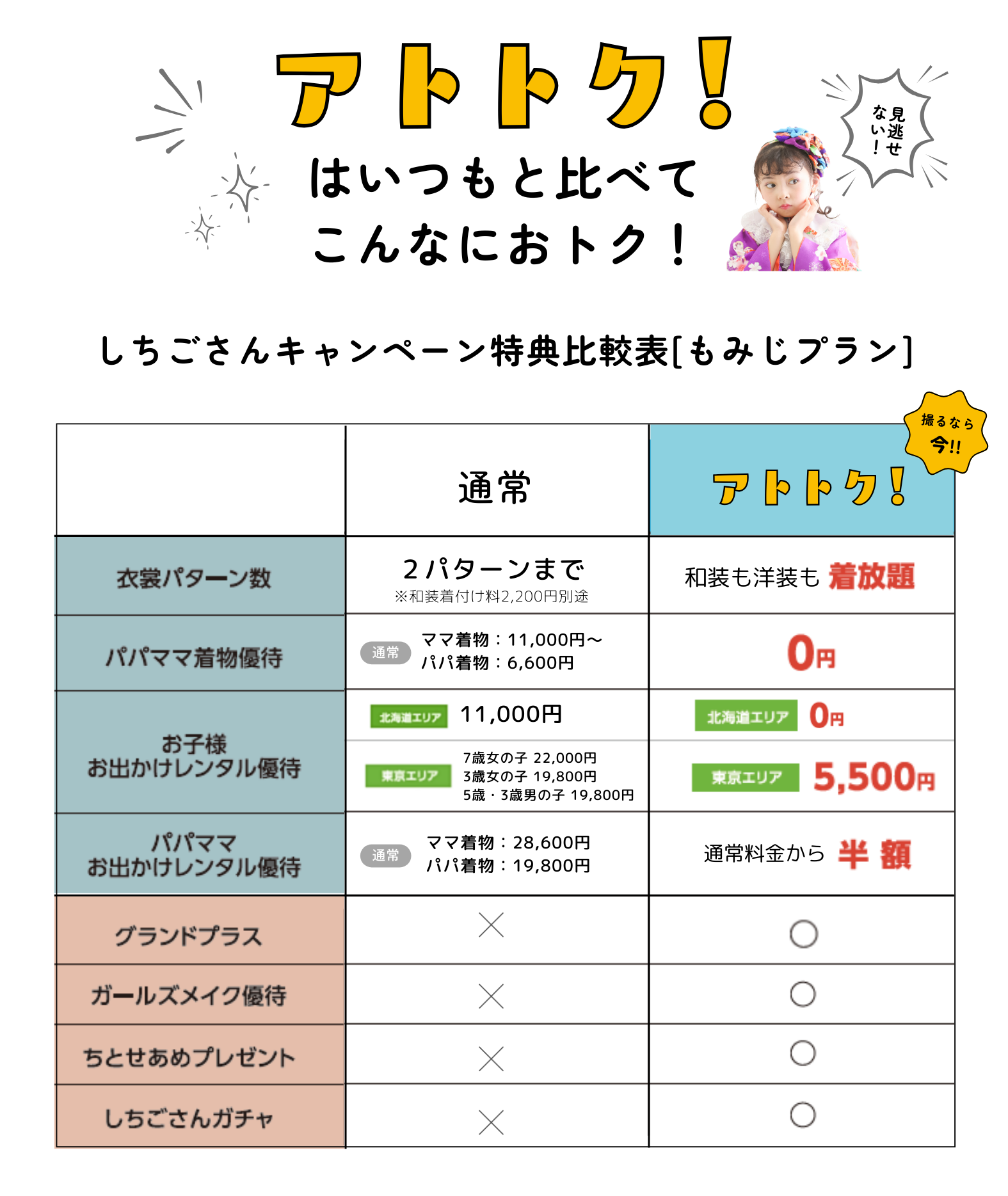 七五三キャンペーン2025につきましては、撮影料・商品プラン代は曜日による変動はございません。